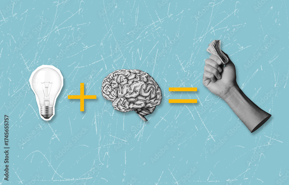 Modern art collage on the theme of rapid income growth. Business Development Brainstorming. Income of stocks and mutual funds.