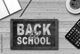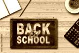 Back to school concept. Office eco friendly supplies, recycling materials, zero waste technologies. Wooden boards background, flat lay, banner format