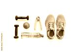 Flat lay of fitness sports equipment. Sneakers and dumbbells for gym. Wellness concept