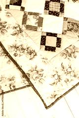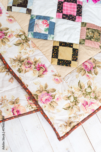 home coziness, vintage, quilting concept. badcovers performed in vintage quilting teqnicue sewed fron piece of satin in gentle colors embosomed with red tape on edges