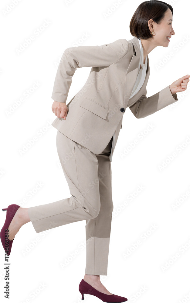 走るポーズのビジネスウーマン スーツを着た女性、スタートや走る、転職などのイメージ 全身 背景透明の合成素材