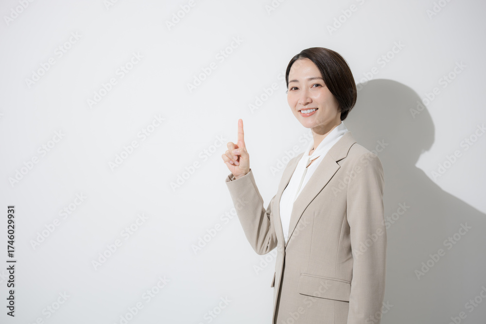 ベージュのスーツを着た立つ若い美人な女性のビジネス上半身のカメラ目線 白背景の営業などリクルートのイメージ ポイントやオススメ、紹介や案内の指差し