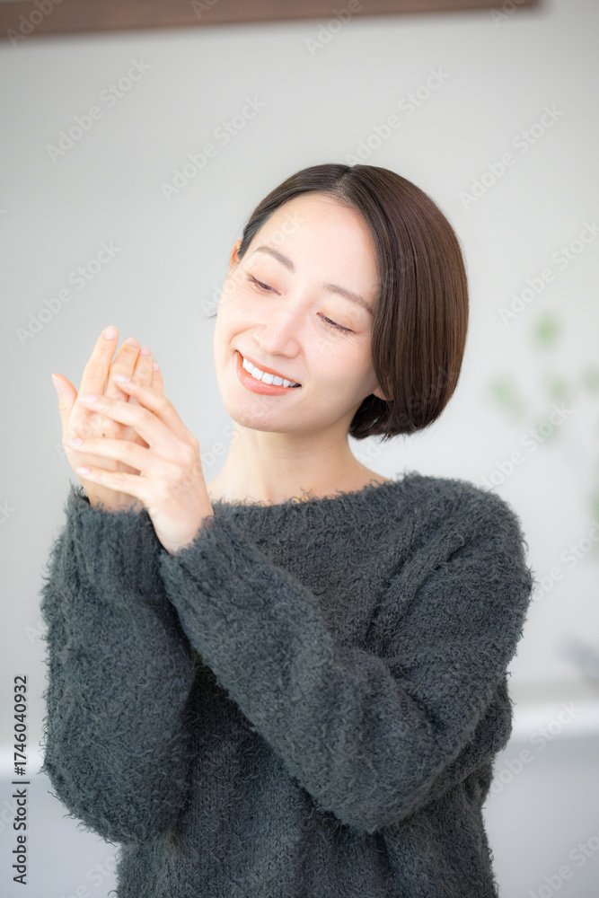 手にクリームを塗ったりケアをする笑顔の女性クローズアップ