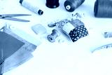 sewing tools, patchwork, tailoring and fashion concept - close-up on white work desk in studio, pincushion, thread spools, measuring meter, buttons, scissors, soap, pieces of colored patchwork fabric.