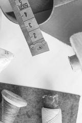 patchwork, sewing and tailoring concept - close-up on tools, measuring meter, blue and pink threads in bobbins and purple and mustard color patches on white background, top view, flat lay, vertical