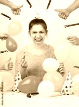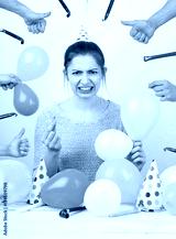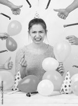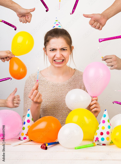 equipment, emotions, celebration concept. young funny jug eared girl with party hat with dots is making angry face with grin while lots of arms are stretching to her with thumbs up