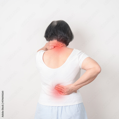 Elderly woman having back body ache for concepts of Back Muscle Strain, Piriformis Syndrome, Low Back Pain, Lumbar Disc Degeneration, Herniated, Osteoporosis, Spinal Compression and Health care