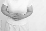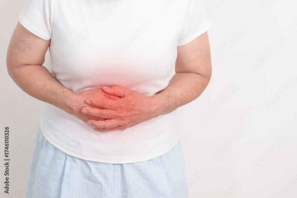 Elderly woman having abdomen aches for Stomach pain, digestion with constipation or Diarrhea from food poisoning, female problem and Endometriosis, Hysterectomy, Stomachache and Menstrual concept