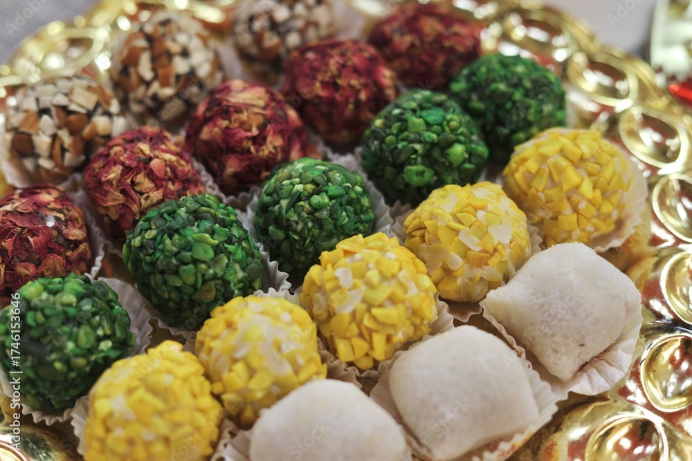 Colorful dry fruit laddu or balls in a gold plate with festival background