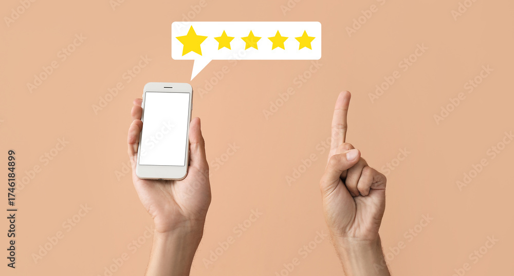 Male hands with modern mobile phone showing something on color background