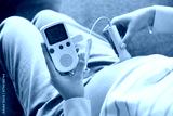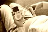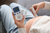 Young pregnant woman with fetal doppler listening to baby's heartbeat on sofa at home, closeup