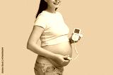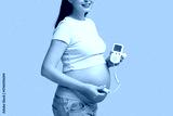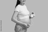 Young pregnant woman with fetal doppler listening to baby's heartbeat on blue background
