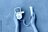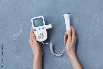 Female hands with fetal doppler on blue grunge background