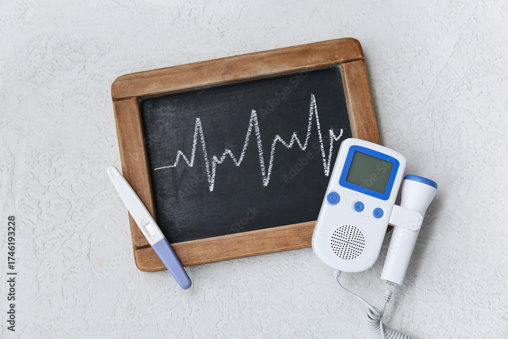 Board with cardiogram, fetal doppler and pregnancy test on white grunge background