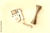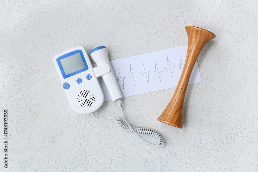 Fetal doppler with pinard stethoscope and cardiogram on white grunge background