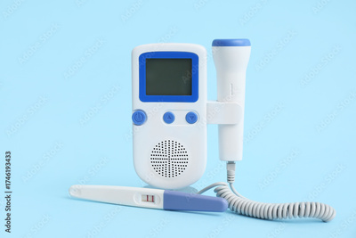 Fetal doppler with pregnancy test on blue background