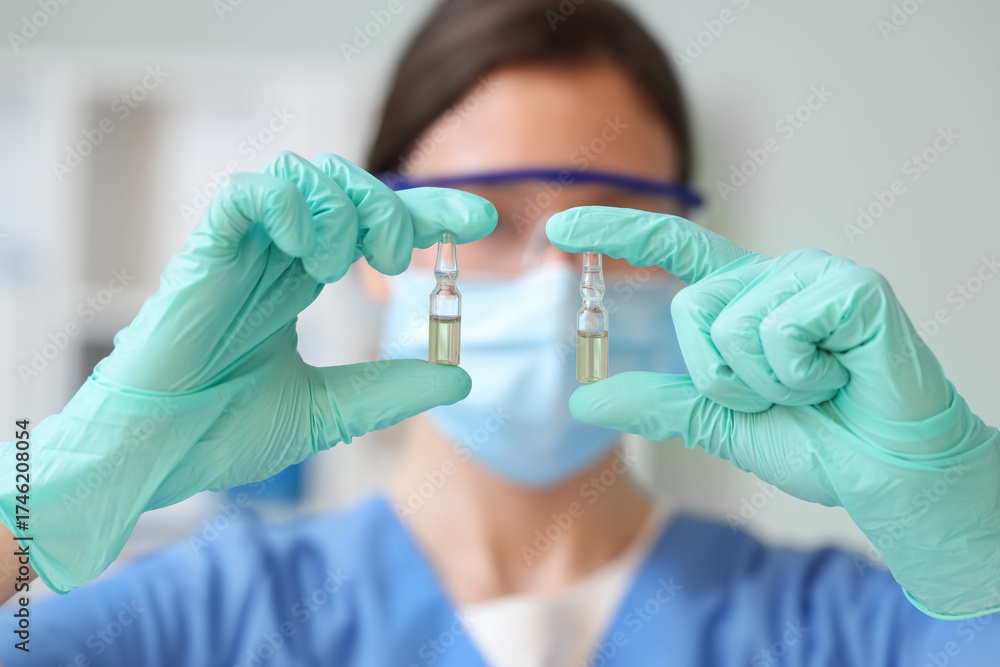 Female doctor with ampules in clinic, closeup