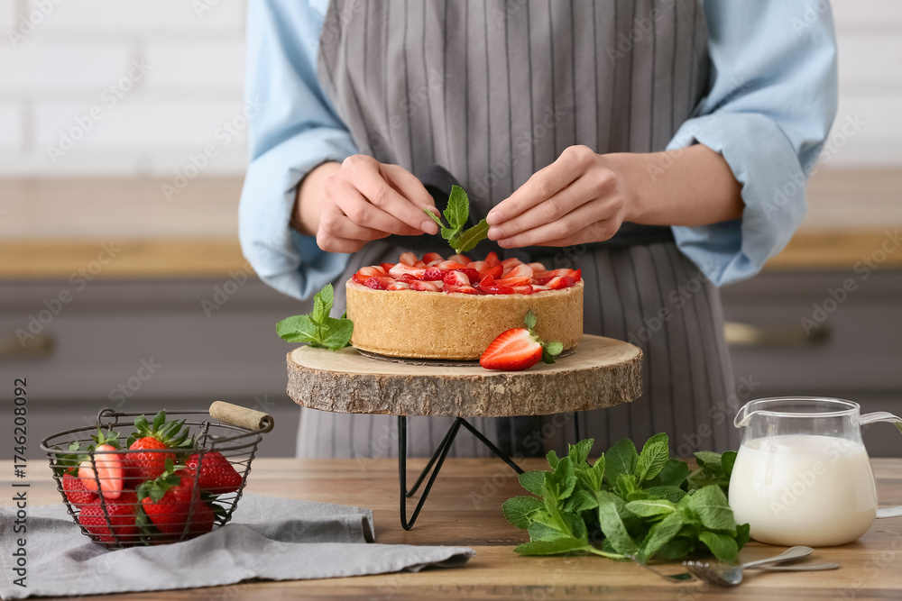 Woman decorating sweet strawberry tart in kitchen