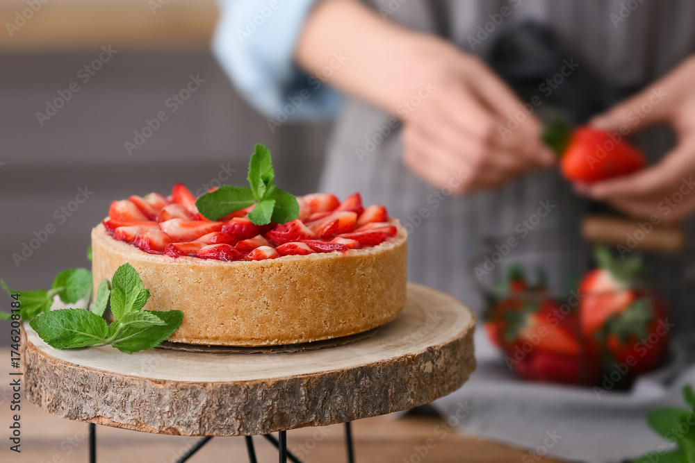 Woman with fresh berries and sweet strawberry tart in kitchen