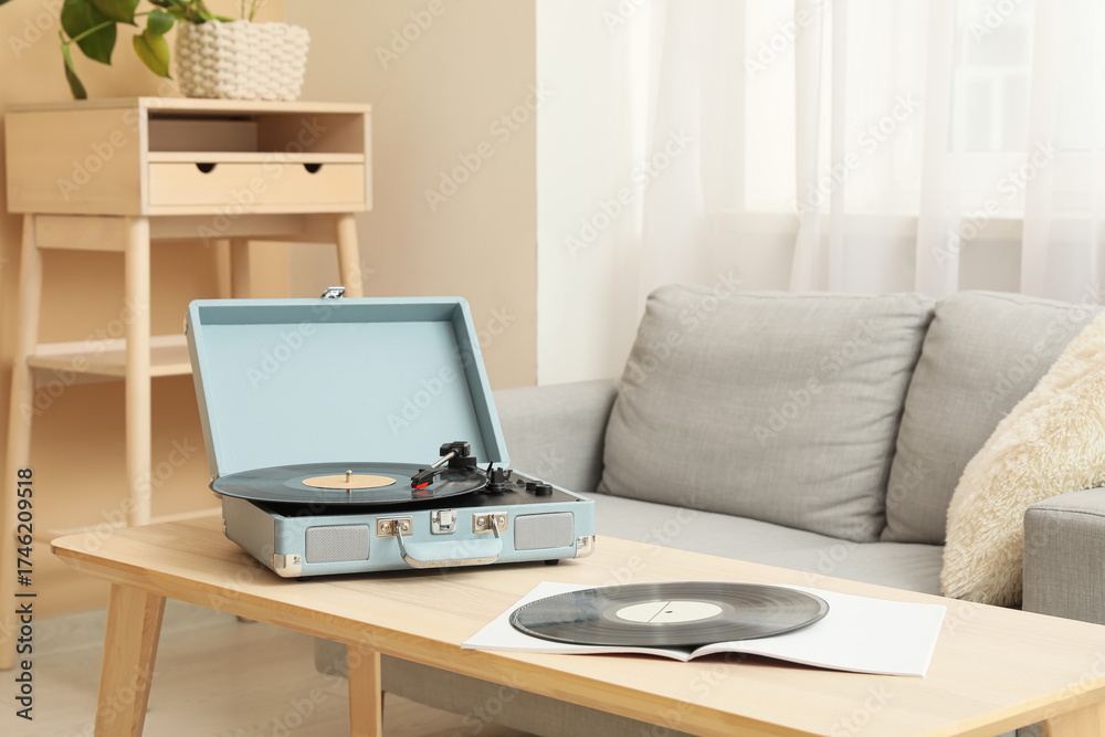 Retro record player with vinyl disks on coffee table in living room, closeup