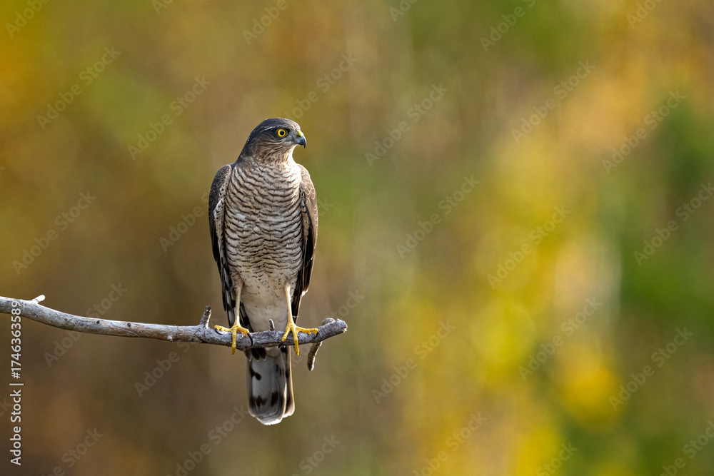 Eurasian sparrowhawk perched on a branch with autumn-colored background