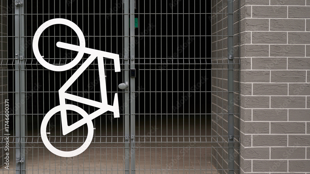 bicycle icon on metal gate symbolizing secure bike parking in urban setting. modern design emphasizes convenience and accessibility for city cyclists. industrial aesthetic meets functionality