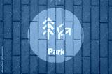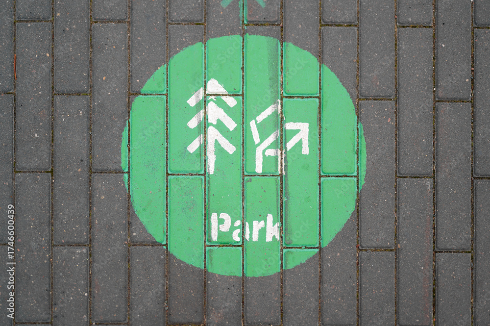 green park direction sign painted on brick pathway indicates route to nearby park with arrow and trees symbol. urban navigation icon for outdoor spaces and pedestrian guides