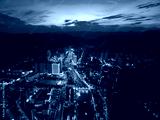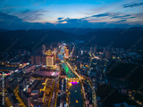 Xuan'en County Hubei Province China city lights gleam across the landscape at dusk illuminating the river and buildings below.