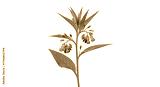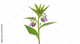 Isolated herbaceous comfrey plant, showing its purple flowers and green leaves against plain backdrop