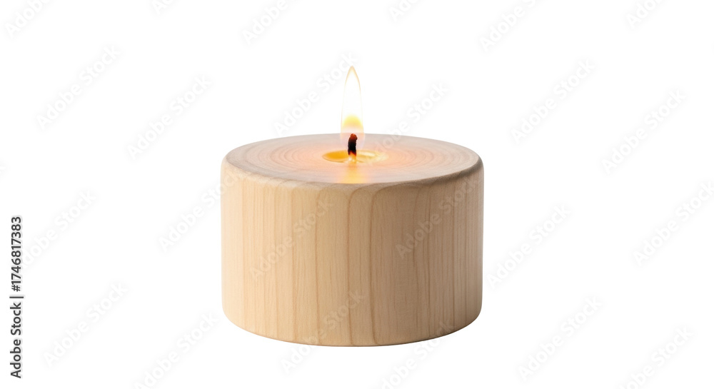 Isolated lighted wooden candle on simple design, perfect for cozy home decor item