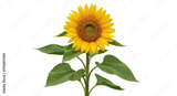 Isolated vibrant sunflower head and green leaves on stem, colorful decorative annual bloom
