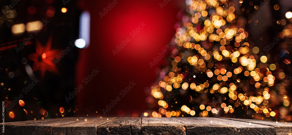 Christmas Tree with Illumination on Red Background. Old Wooden Boards