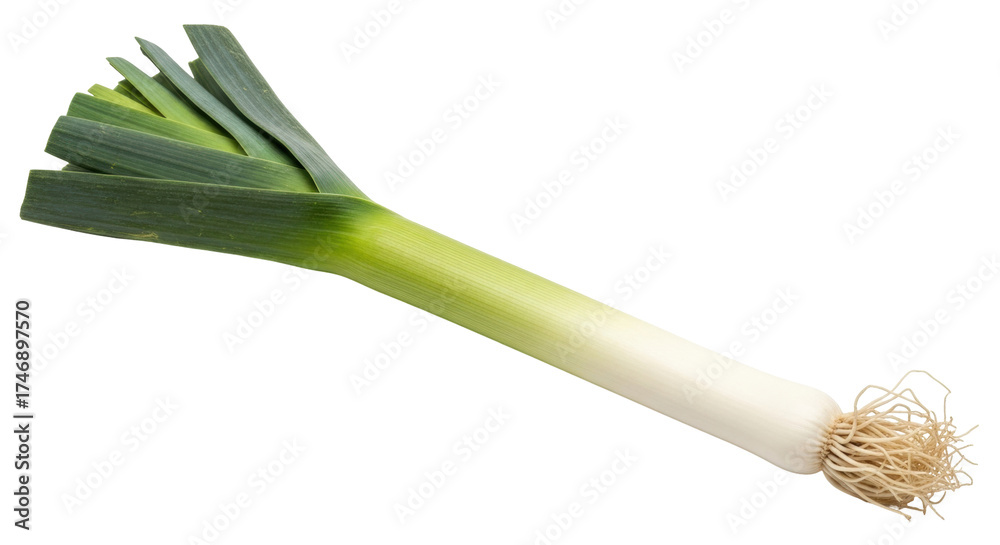 Isolated leek with fibrous roots is used in cooking, has mild onion-like flavor, and is tasty