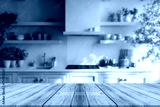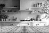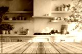 Wooden table top with blurred kitchen background.