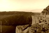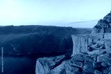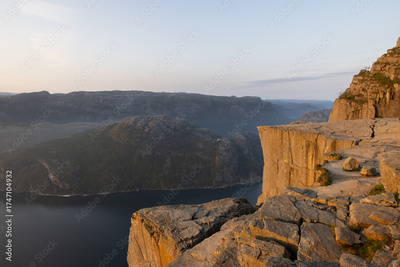 Preikestolen - amazing rock in Norway. Girl standing on a cliff above the clouds. Pulpit Rock, the most famous tourist attraction in Ryfylke, towers over the Lysefjord