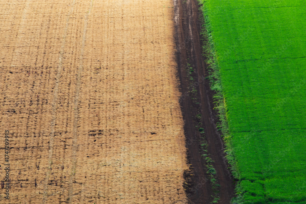 Background texture pattern of green and gold swaths of land seen from Tasmanian farm road in Australia
