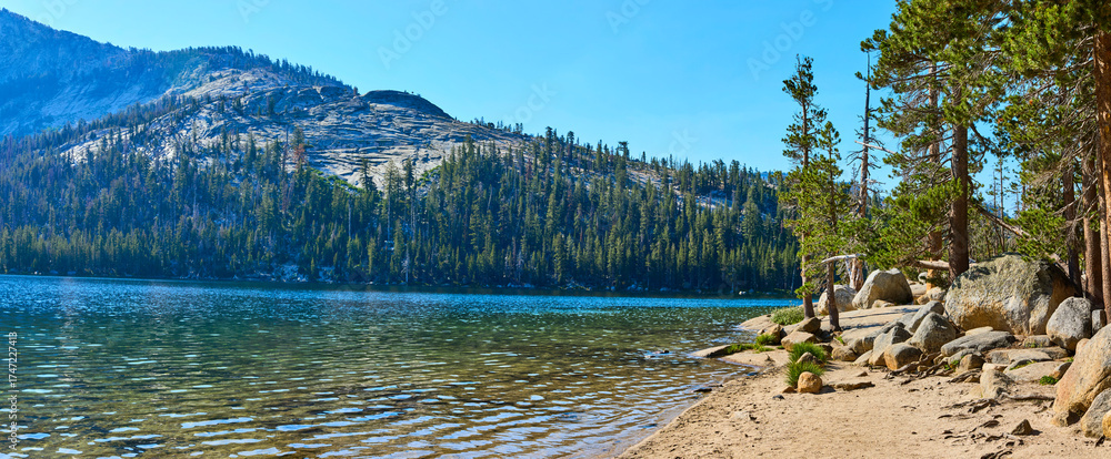 Panoramic Tenaya Lake Shoreline Pines and Granite Mountain in Yosemite National Park