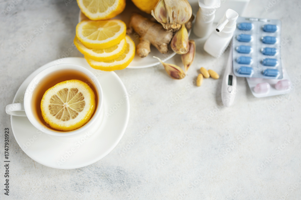 Cold and flu season treatment still life with cup of tea, lemon, pills, thermometer, nasal sprays, garlic and ginger, health and wellness concept