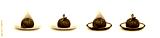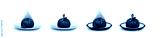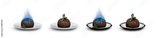 Low angle view of a collection of round plates, sprigs of holly and a traditional Christmas pudding soaked in brandy and lit giving blue flames isolated against a transparent background.