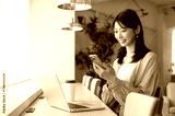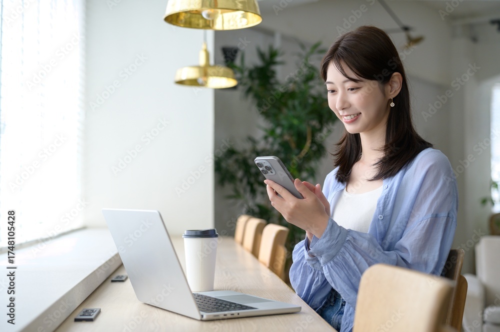ノートパソコンで仕事をするオフィスカジュアルの女性