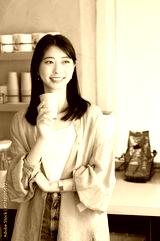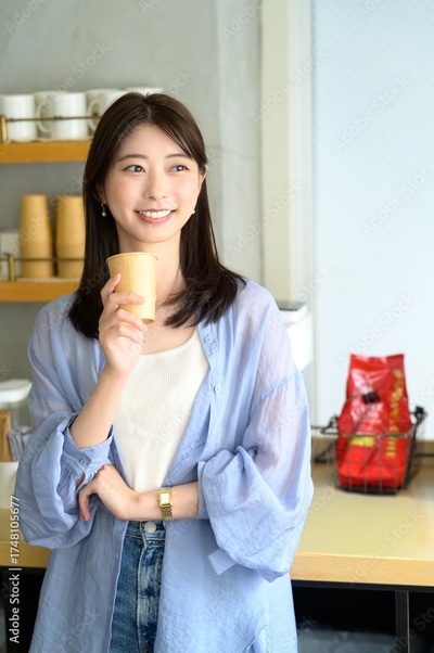 カフェでコーヒーを持って微笑む日本人女性