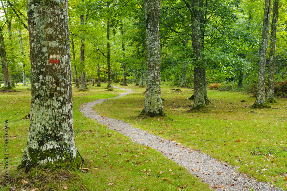 Forest trail. A path crosses a forest of green oak trees, Navarre.
