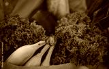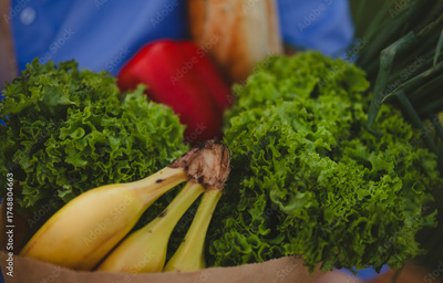 paper shopping bag with vibrant vegetables and fruits, shopping trip to local farm market on sunny day