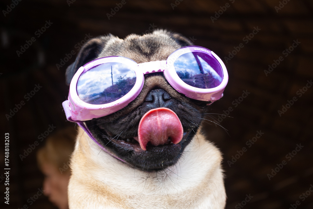 Cute pug dog wearing pink sunglasses with tongue out, showing a funny and playful expression. Adorable pet portrait with personality and humor.