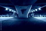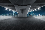 Empty Asphalt Road Under Bridge with City Skyline Lights in the Distance