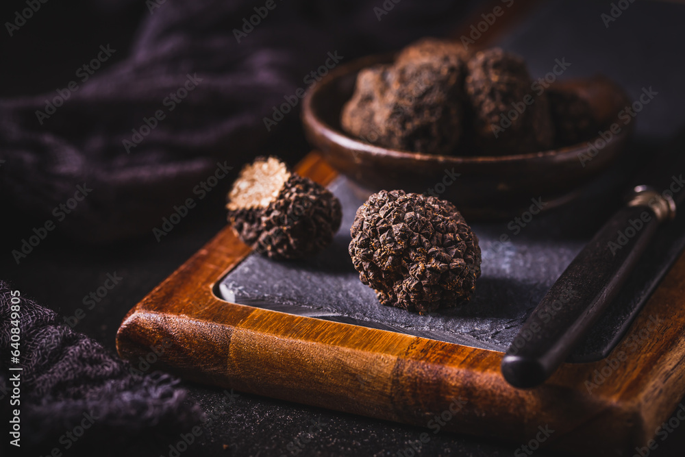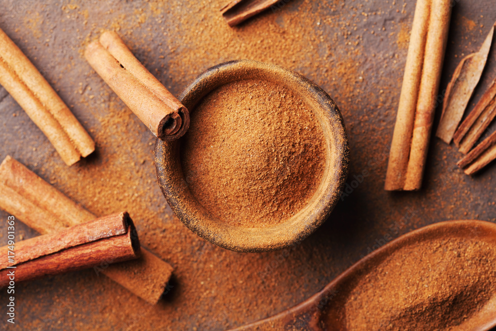 Cinnamon sticks and powder on brown rustic table top view. Aromatic spices.