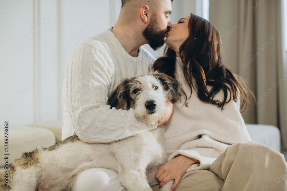 Couple kissing holding dog celebrating christmas