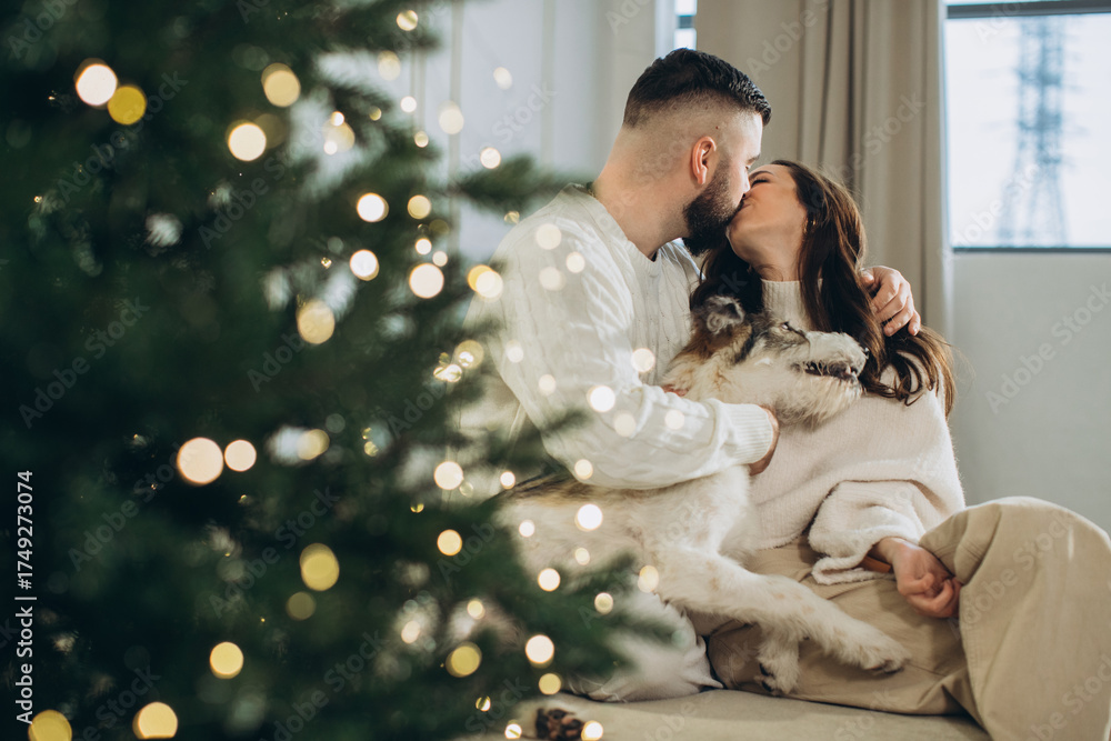 Couple kissing cuddling dog by christmas tree
