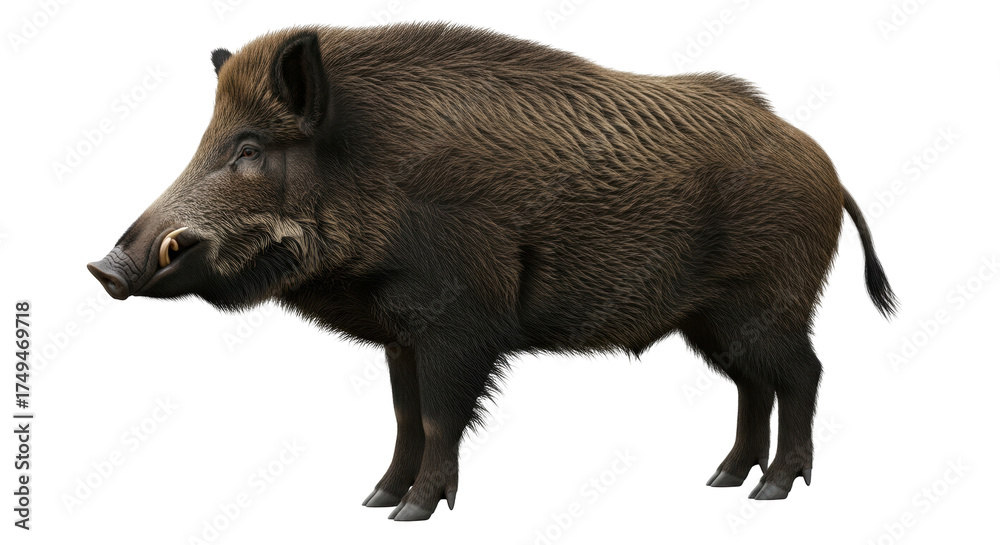 Isolated wild boar, side view of an adult with tusks, forest animal, wildlife photo
