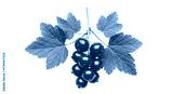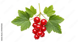 Isolated shiny red currants hanging from a stem with green leaves growing on a branch